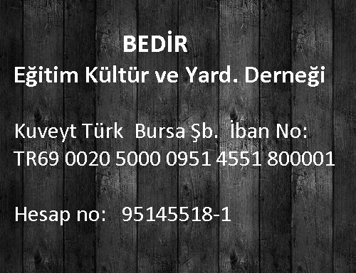 BEDİR EĞİTİM KÜLTÜR VE YARD. DERNEĞİ  :  TR69 0020 5000 0951 4551 800001  Kuveyt Türk Bursa Şubesi: